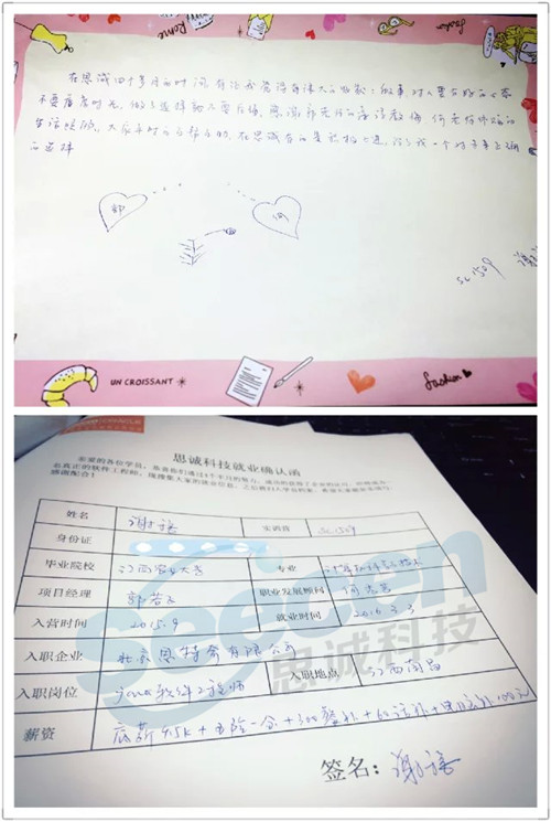 如今的谢*已经入职北京**有限公司,薪资6.5K+五险一金+餐补、话补、电脑补福利,回报和自己的努力妥妥地成正比的。逆流中她选择华丽转身,没有好的出路,那就选择改变,选择未来。在思诚开始的人生第二次学习生涯,给她带来很多的改变。她也说道,当真正成为思诚科技家庭的一员,融入其中才能真正体会并理解它的宗旨——关注客户体验。